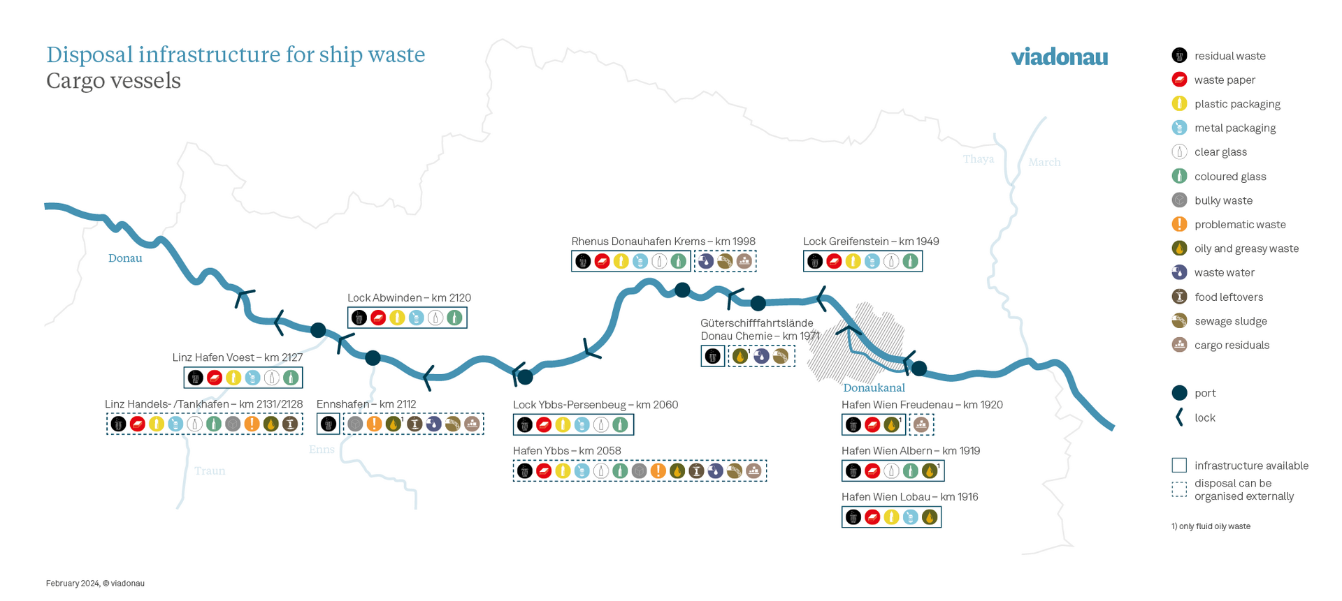 Along the Austrian Danube stretch the following ports provide waste reception facilities for cargo vessels or arrange a disposal service on demand: