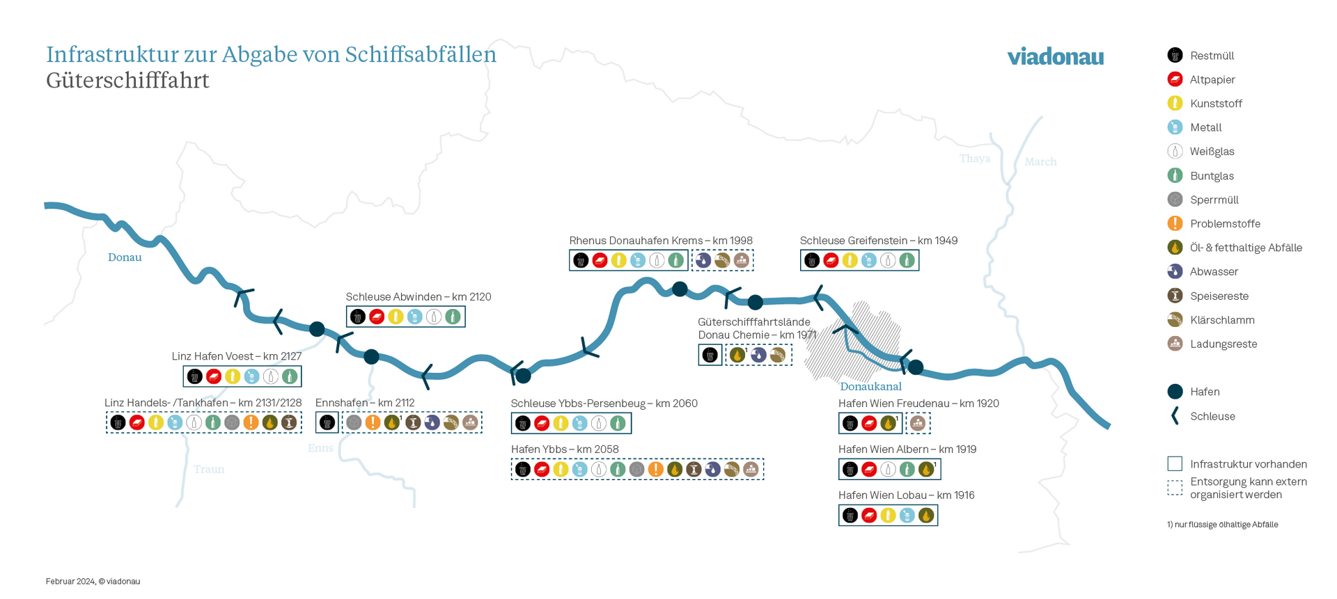 Entlang der österreichischen Donau stehen der Güterschifffahrt Abfallentsorgungseinrichtungen in folgenden Häfen zur Verfügung bzw. eine Abfallübernahme kann vor Ort durch externe Firmen organisiert werden: