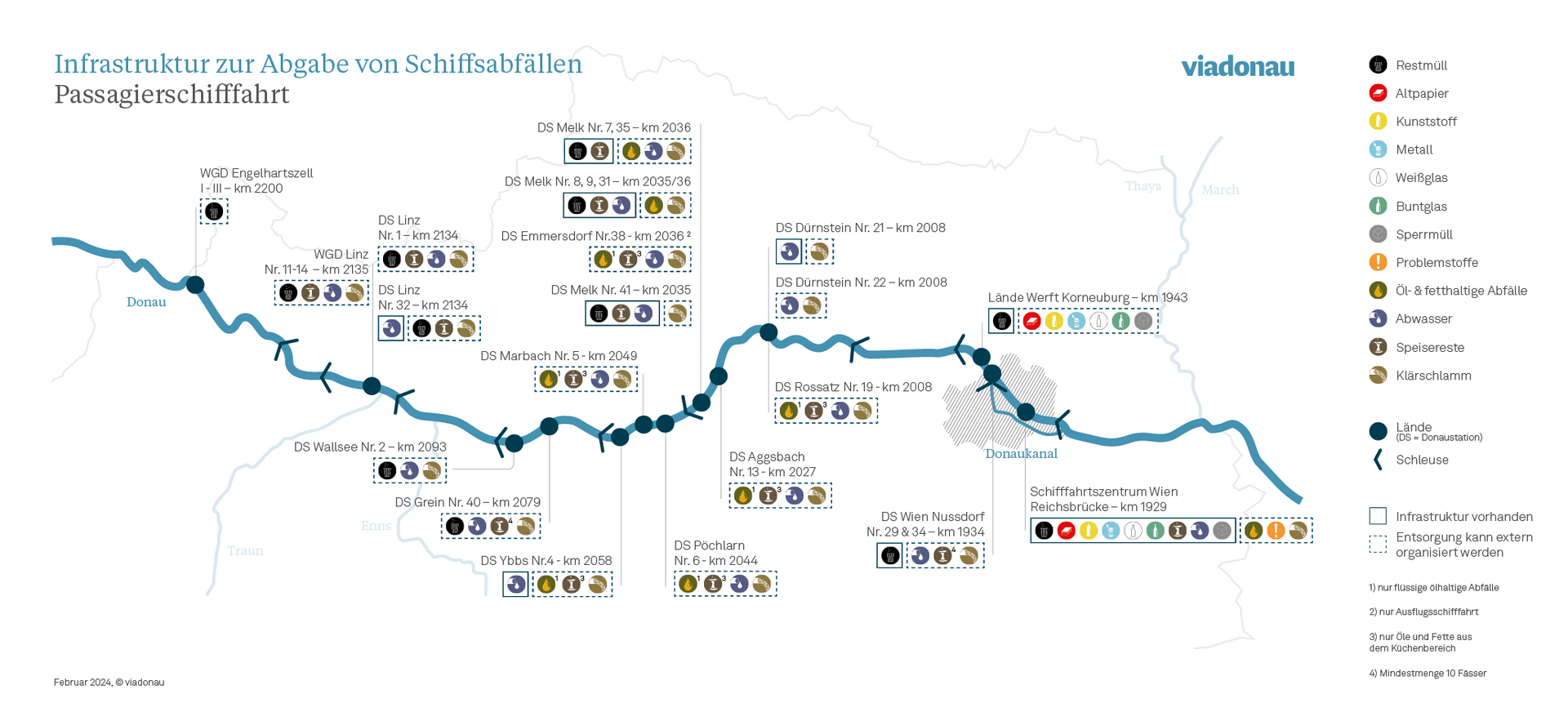Für die Passagierschifffahrt stehen an ausgewählten Länden Entsorgungsmöglichkeiten zur Verfügung. In den meisten Fällen ist es notwendig sich mit dem Ländenbetreiber in Verbindung zu setzen um entweder die Entsorgung anzumelden oder die Entsorgung über eine externe Firma zu veranlassen. An folgenden Länden stehen die angeführten Entsorgungsmöglichkeiten zur Verfügung*: